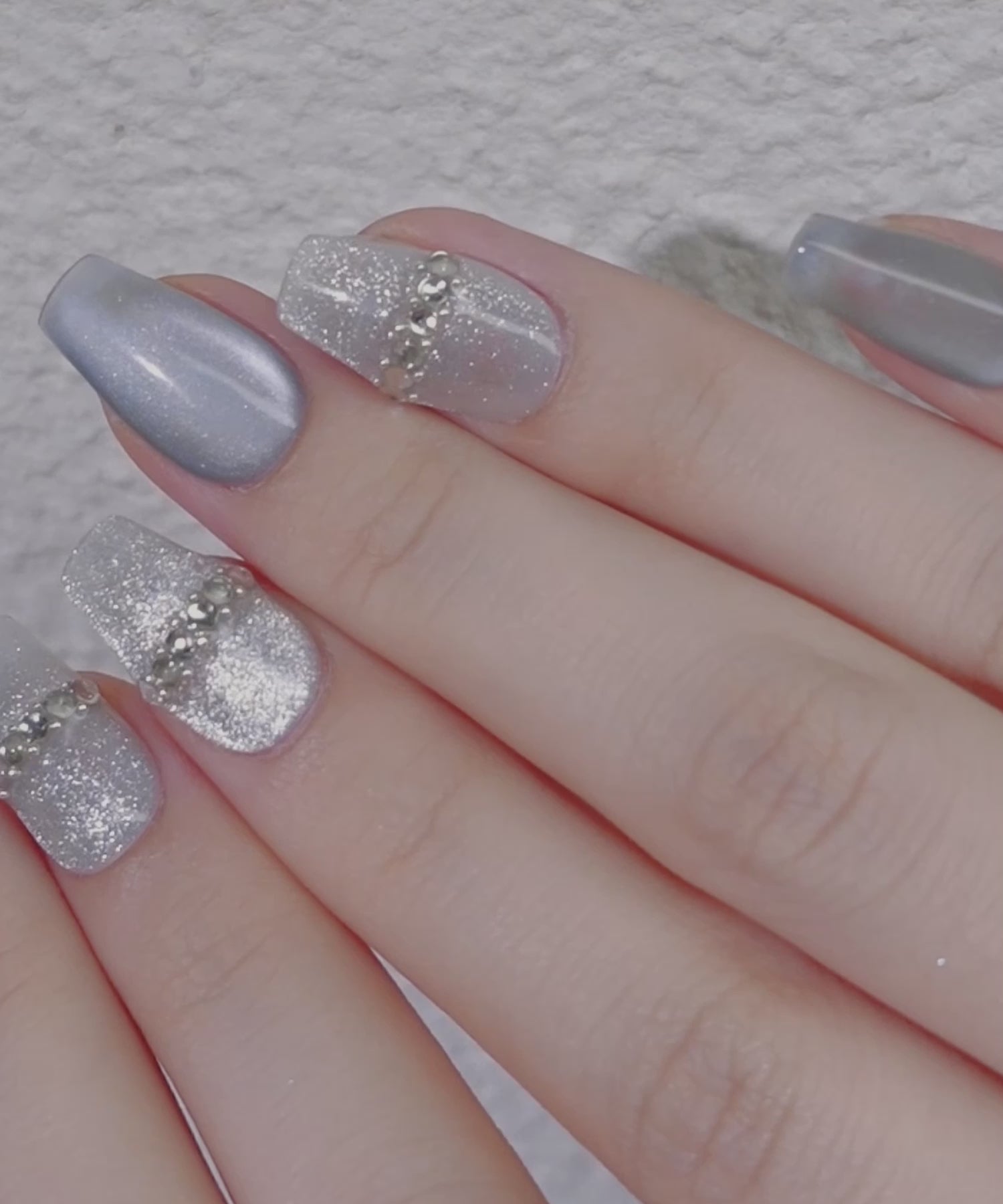 Silky blue magnetic nails x silver magnetic nail tips with cute stones