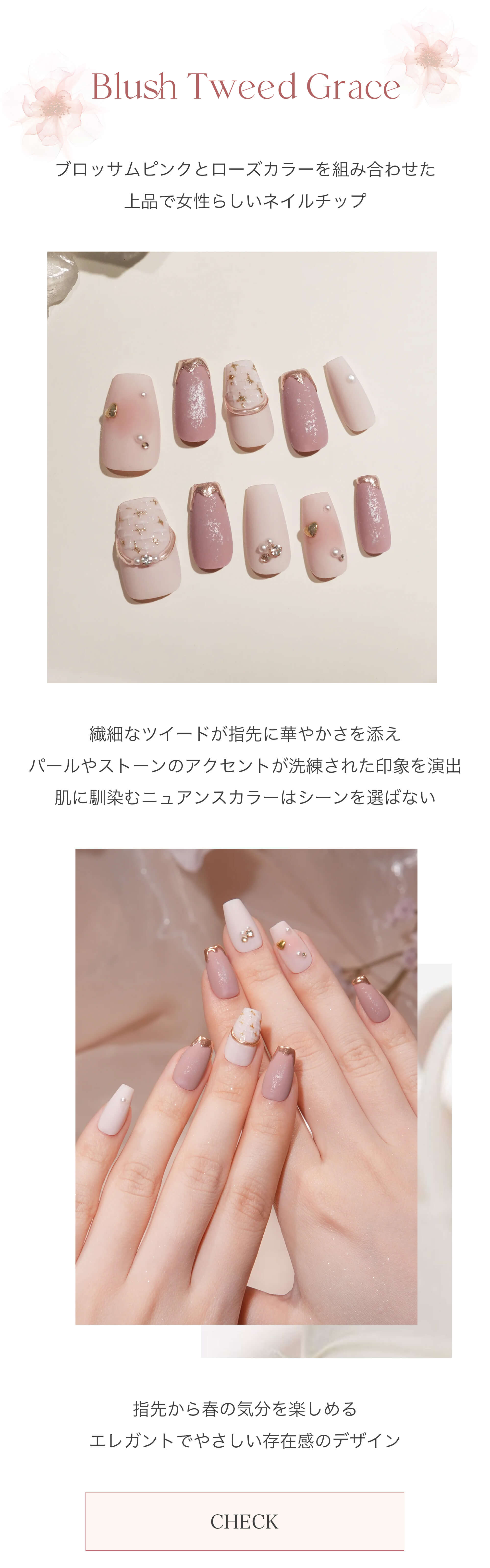【当日発送】水光ネイルマットピンクツイードゴールドミラーパールストーンバレリーナネイルチップ